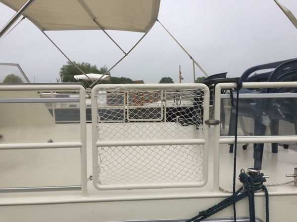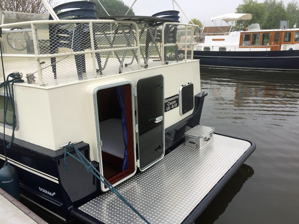 ![]() Eine Tür in der Reling. Zur Freude der Menschen, zum Ärger der Hunde. Jetzt kann man nicht mehr unkontrolliert von Bord. ![]() Auf dem Oberdeck sind jetzt auch Türen in der Reling. Dieser Ausgang kann in Industriehäfen mit hoher Kaimauer hilfreich sein. Badeplattform mit Tür hinten. Ein zusätzlicher Ausstieg, wenn wir im Hafen in einer "Box" liegen. Die Tagestour