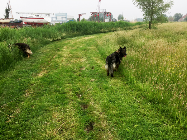 Hund an BordTour Frühjahr 201803.06.18 Hundetag Das Boot bleibt an der Leine - die Hunde kommen von der Leine ! Morgens auf der Hundewiese im Hafengebiet (bei der Brandsma - Werft):