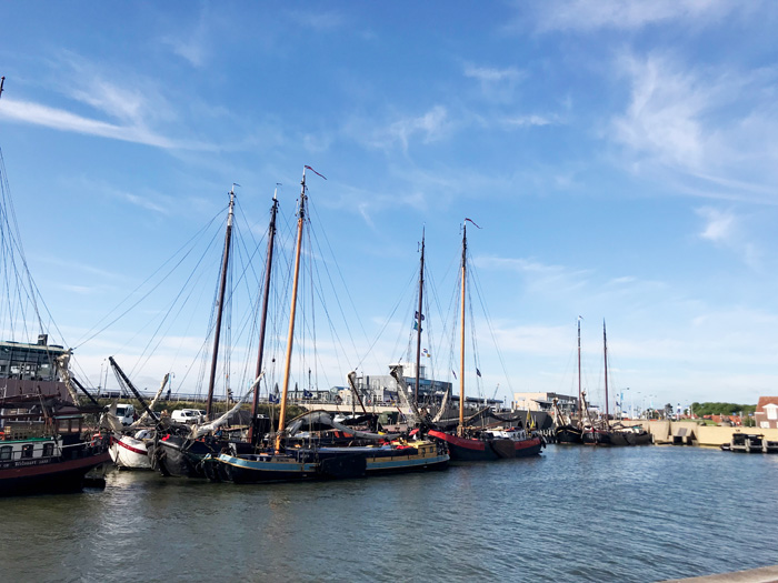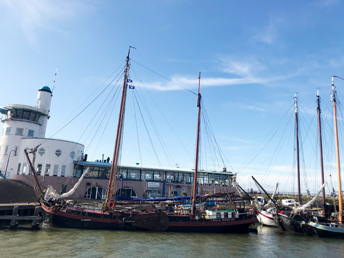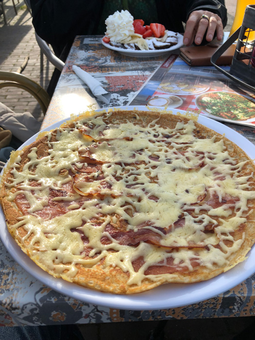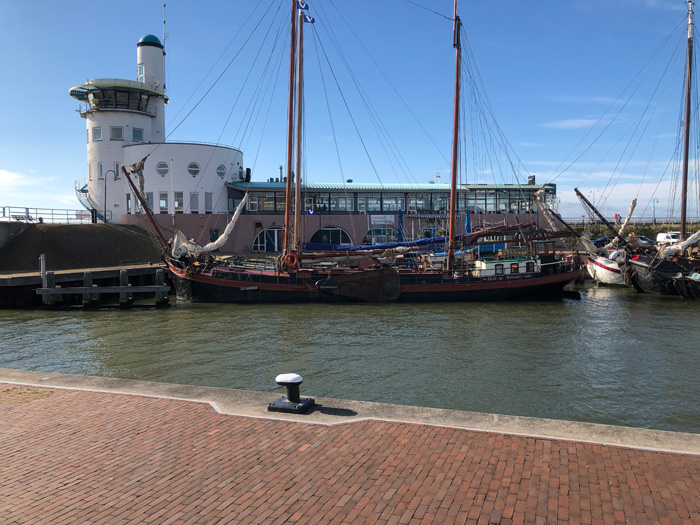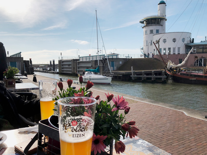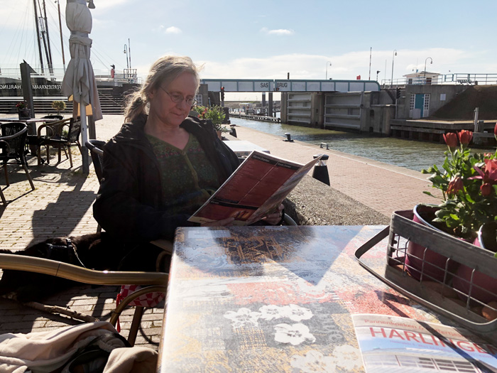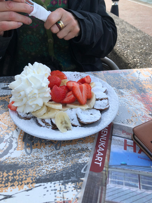 Was machen wir - statt loszufahren? Wir gehen an den Strand. Das nennt man - glaub ich - "große Liebe". Am Abend dann ein bischen was Essen im Poffertjeskraam Harlingen (direkt am Hafen) Für den Mann gibt's was mit Käse, Speck und Schinken. Für die Frau gibt's was Süßes. Und für beide ein gutes Bier dazu. Und während wir uns die Kalorien reinkloppen .....