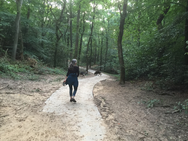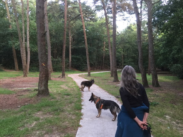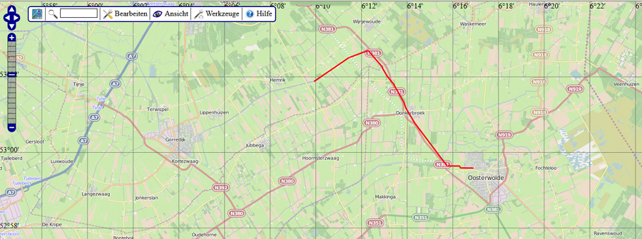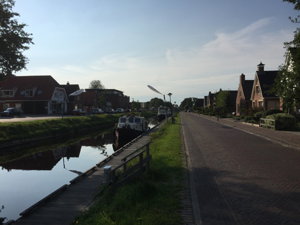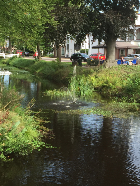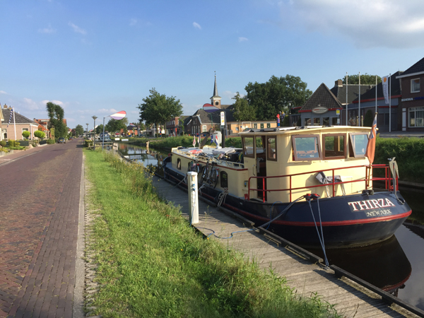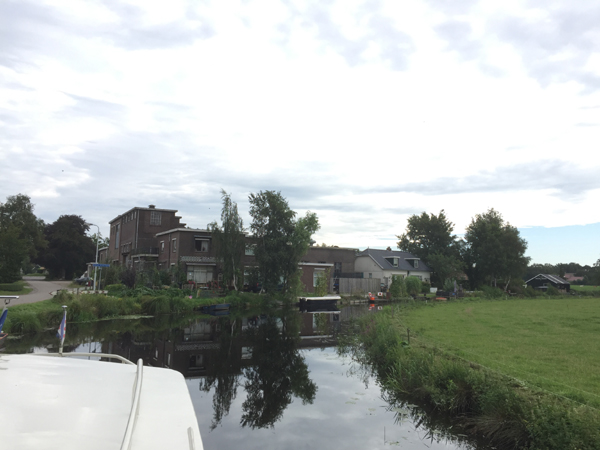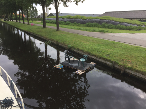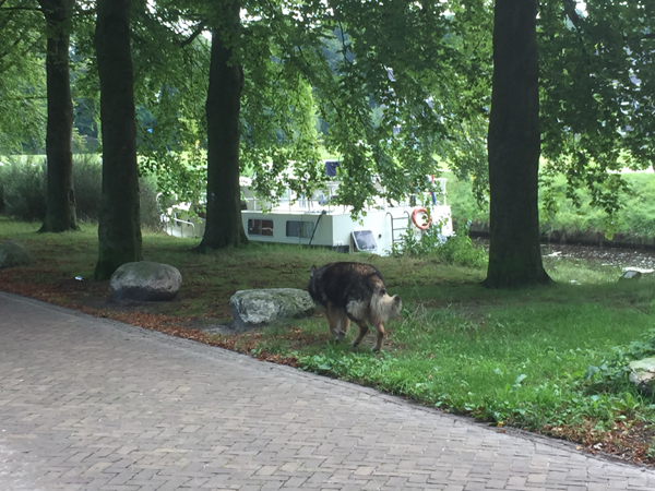 Route in Karte: ![]() Hier hat sich jemand eine kleine, schwimmende Terrasse gebaut. Landschaftlich ist das Kanalstück vor Donkerbroek einer der schönsten Kanäle, die wir bisher gefahren sind. Bei den weit in den Kanal rein hängenden Bäumen und den teilweise untiefen Ufern, wünscht man sich aber möglichst keinen Gegenverkehr. Hatten wir auch nicht! Mittags um 1, Liegeplatz in Oosterwohlde. Pinkelpause für die Hunde. Fahrt von Oosterwohlde nach Appelscha Distanz: 6,35 KM Fahrtzeit: 2 Std.