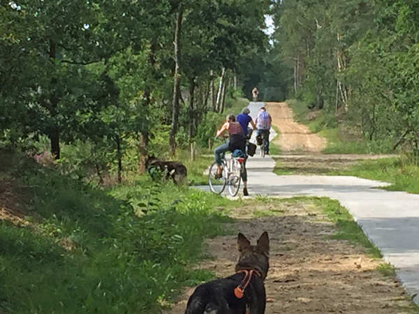 Hund an Bord30.08.2015 Wir haben uns entschlossen, einen Tag in Appelscha zu bleiben. Wir haben uns Fahrräder gemietet (gute Räder für 8,- pro Stück und Tag) und sind in den Wald gefahren. Das Wetter war sonnig, recht war (ca. 24 Grad). Die Landschaft ist deutlich anders wie im Rest von Friesland. Wir sind jetzt deutlich höher (das Schleusen fahren war wie Treppen steigen), der Boden ist trockener, der Wald geht teilweise in Heidelandschaft über. Auch zu Fuß auf kleinen Waldwegen ist man nicht sicher..... .....von hinten kommt ein Mountain-Biker mit "Affenzahn". Müder Mann (und müde Hunden im Schatten unter der Bank) machen Rast am Buitencentum in Terwisscha. Eine Toteiche am Buitencentrum, schön beschnitzt. Insgesamt haben wir uns in Appelscha sehr wohl gefühlt. Der Liegeplatz ist wirklich nicht so toll. Aber das "Drumherum" entschädigt hierfür. 2 Supermärkte, viele Restaurants und - vor allem - die Möglichkeit, mit den Hunden ausgiebig zu laufen. Übrigens: Im Drents-Friese Wold ist das größte Hondenlooslopgebiet der Niederlande. |
