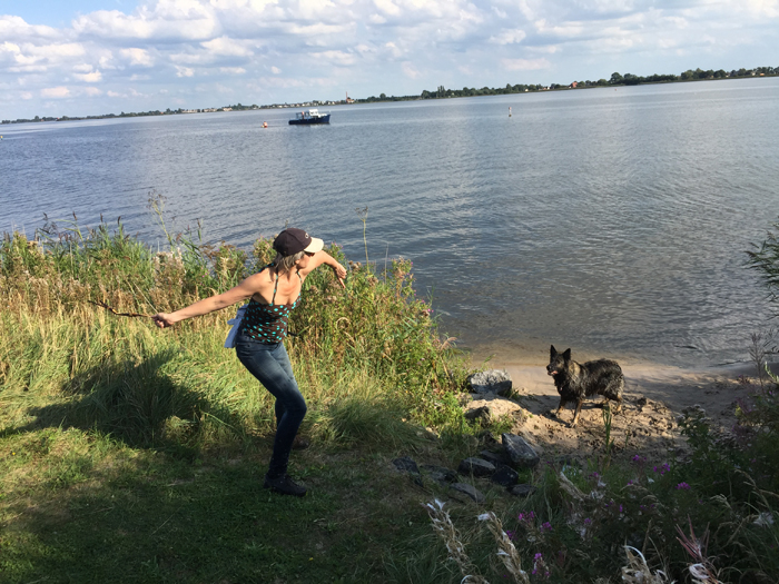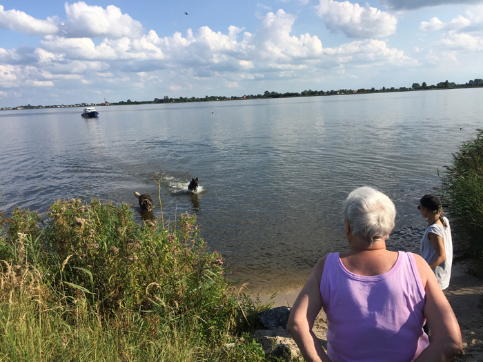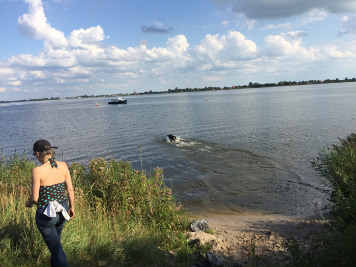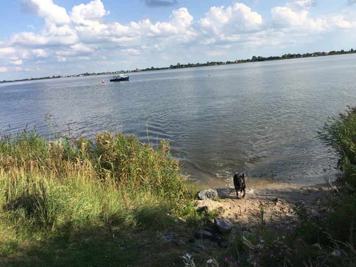 Auf Langehoekspolle kann man gut liegen und gut mit den Hunden laufen. Wir haben die Insel in vorangegangenen Touren mehrfach angefahren und konnen immer wieder gern hierher. . Fahrt von Langehoekspolle nach Marchjepolle (Insel im Tjeukemeer) ![]() 24,5 KM - 2 Std. 45 Min. 1 bewegliche Brücke - kein Brückengeld sonnig bis leicht bewölkt, trocken, warm, kaum Wind freier Liegeplatz der Marrekrite - kein Liegegeld Auf dem Tjeukemeer - Marchjepolle kommt in Sicht. Auch Marchjepolle muss immer wieder wegen Lotte angefahren werden. Die Insel hat einen wunderschönen Strand. Ein Tipp für Leute mit kleineren Kindern: Der Strand läuft so flach ins Wasser, dass Lotte ca. 200m läuft und erst dann in den "Schwimmerbereich" kommt. Neben dem Boot im Hintergrund ist die Begrenzungstonne für den Nichtschwimmerbereich. Der Hund hat Arbeit - die Frau hat ´ne knappe Minute Ruhe. Die Insel ist recht "übersichtlich", in einer Viertelstunde ist man einmal rum. Für die Hunde trotzdem einer der liebsten Plätze. Und müde werden sie am/im Wasser. |